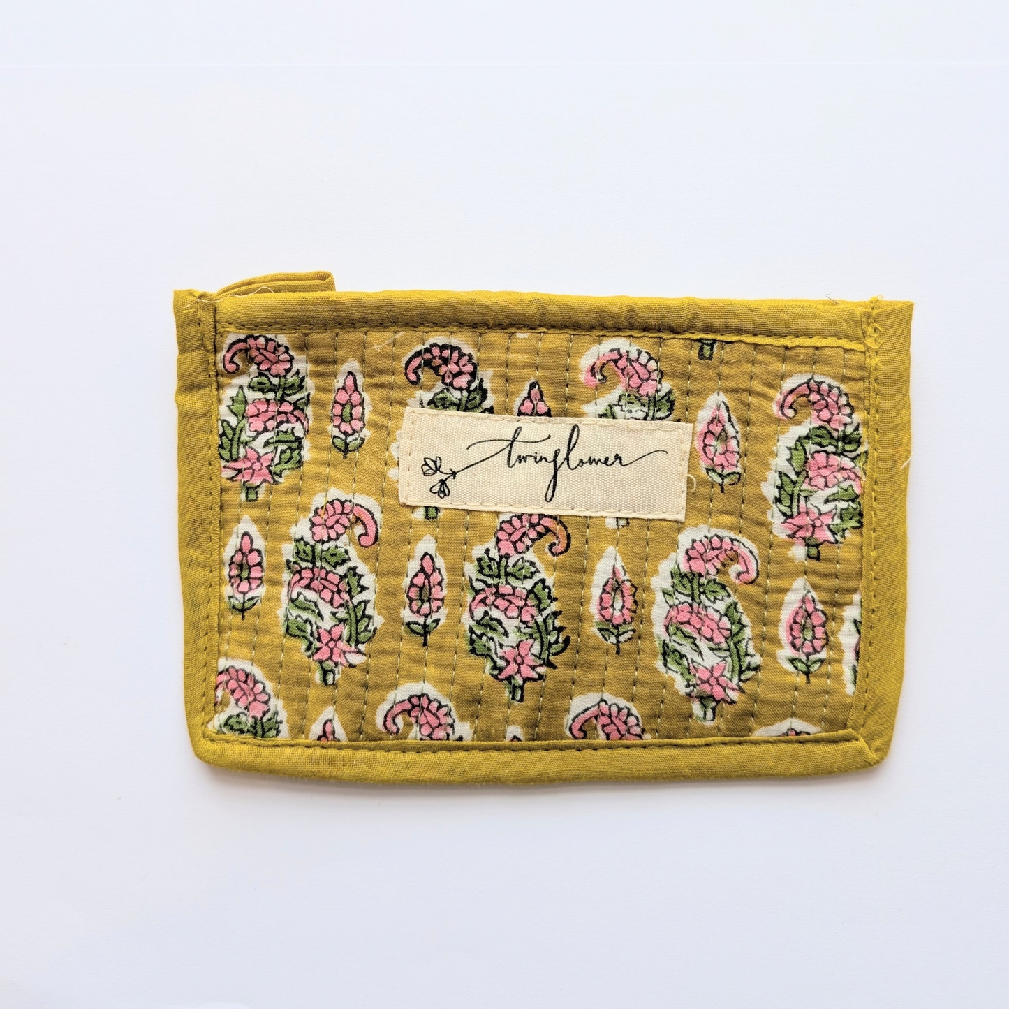 Yellow & Pink Flower Block Print Quilted 3 Fold Travel Bag