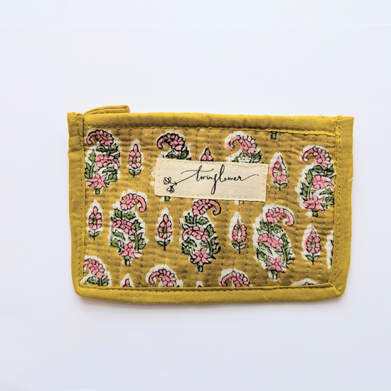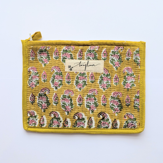 Yellow & Pink Flower Block Print Quilted Large Washbag